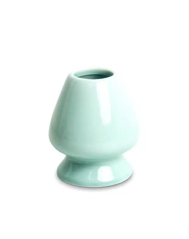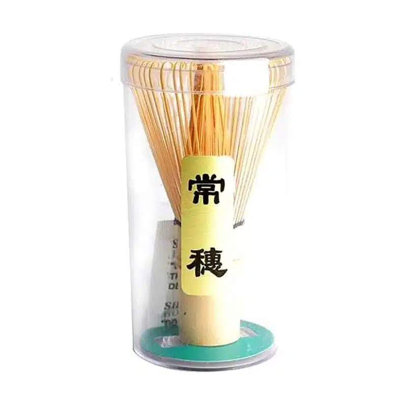 Klop de matcha: Gebruik een bamboe matcha klopper (chasen) om de matcha te kloppen. Houd de klopper vast in één hand en klop met de andere hand snel en gelijkmatig in een “W”-vormige beweging totdat er een schuimige laag op de thee ontstaat.