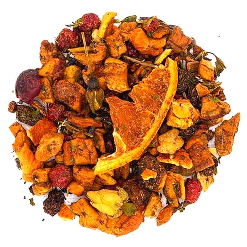 Appelstukjes, gezoete mangostukjes, sinaasappelstukjes, gezoete ananasstukjes, kaneel, kaneelstokjes, rozijnen, sinaasappelschil, citroenmelisseblaadjes, cranberry’s, gele rozenknopjes, lavendel, saffloer, bloemblaadjes en natuurlijke aroma